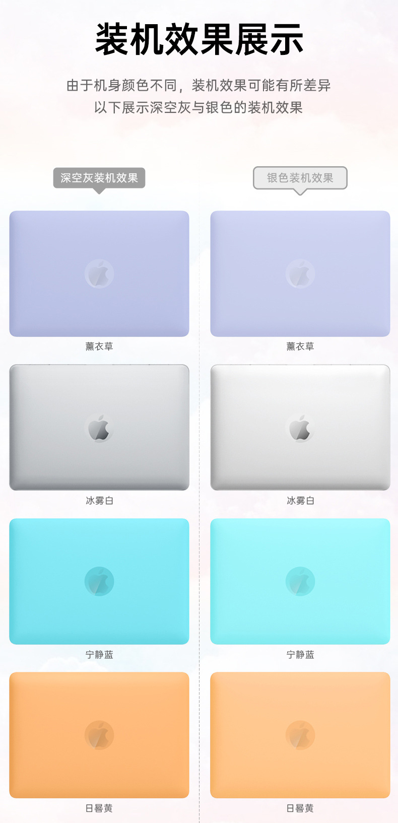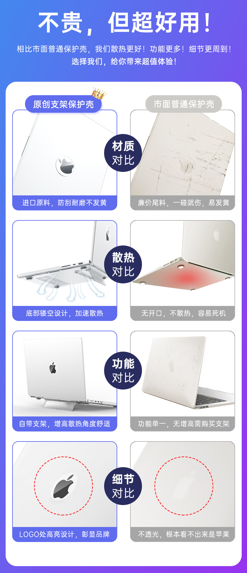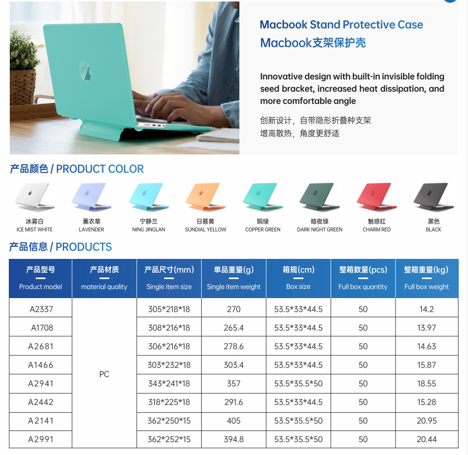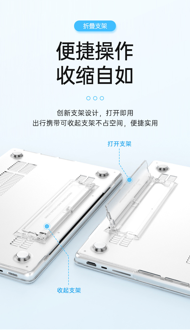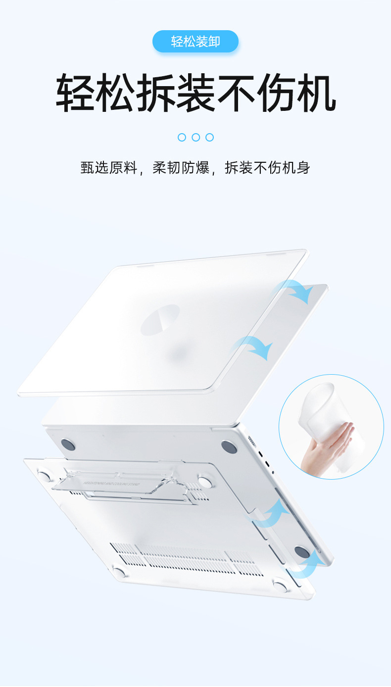 二:特点:自带支架功能,增高散热好,磨砂透明款,材质软不易变形,纯PC硬壳,8色可选,源头生产厂家